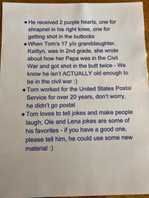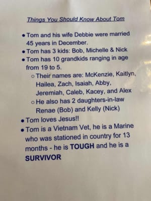 The “stuff” told the hospital staff about Tom’s life, his family, and what he is like. It was a unique attempt to bring the staff closer to the patient. And it worked. “The staff was taking photos of it,” Michelle smiled.